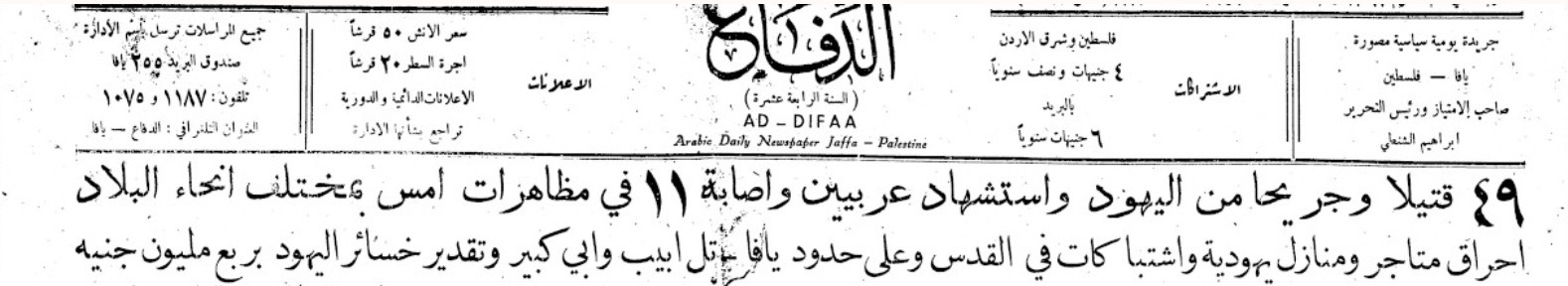 Arab newspapers continue to chronicle attacks – and celebrate them. Ad-Difa’s front page led with ongoing Arab violence and noted that 49 Jews had now been killed – a cumulative total reported without any suggestion of regret.
