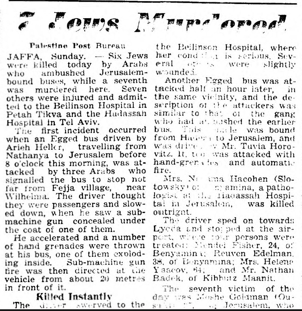 The article described bus ambushes around Jerusalem, attacks in Lod, Tulkarm, Haifa and Jaffa, and other assaults on Jewish civilians.