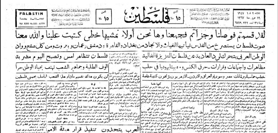 The front page of the Falastin newspaper is entirely about Arab/Islamic mobilisation, outrage, anti-Jewish actions in the region, and calls to resist partition. The newspaper triumphantly boasted about anti-Jewish pogroms not only in the Mandate area but throughout the Middle East: