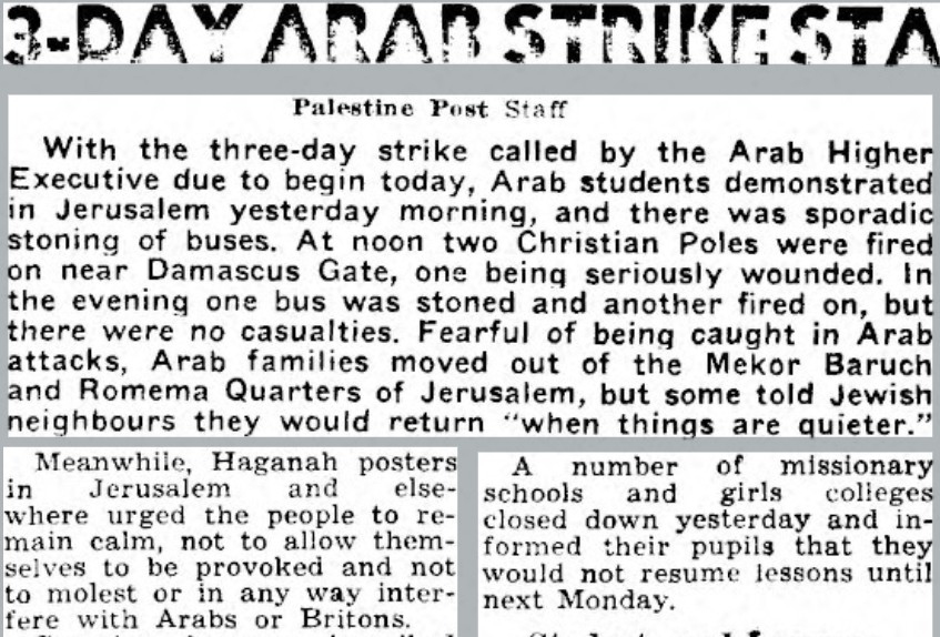 On the same day, the Palestine Post described the beginning of the Arab strike and repeated Jewish calls for restraint. It also reported that Arab families were leaving mixed neighbourhoods to avoid the violence their own side was generating – a detail that matters deeply for later refugee debates.