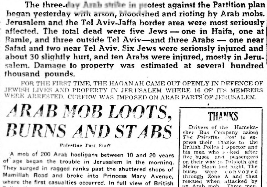 This Palestine Post piece from December 5 describes further attacks on remote Jewish settlements with the Haganah claiming they had successfully ‘repulsed attacks’. In these early days it is impossible to know how much of this was fully accurate and how much was meant simply to calm the nerves of a Jewish community suddenly facing existential threat.