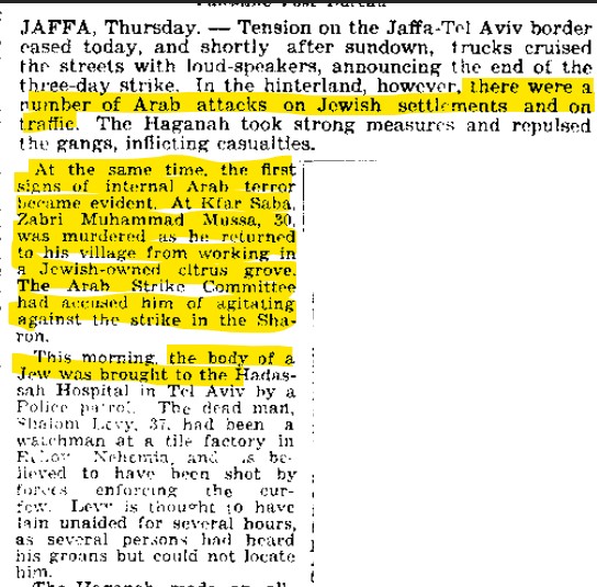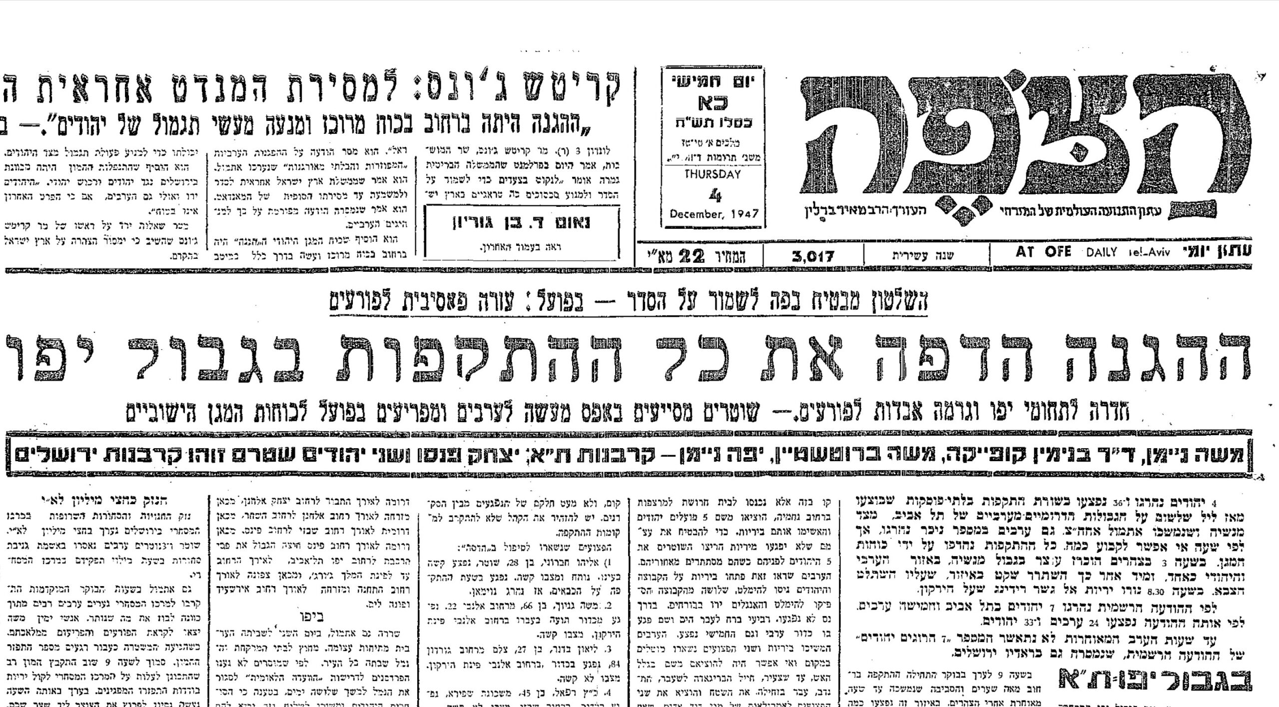 HaTsofe reported four Jews killed and dozens injured in what it explicitly called ‘unprovoked attacks.’ It also noted that the Haganah had repelled Arab assaults along the Tel Aviv–Jaffa border with Jewish civilians the primary targets.