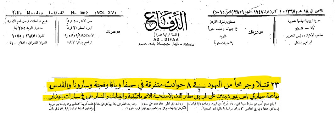 Its headline read: “23 Jews killed and wounded in 8 separate incidents in Haifa, Jaffa, Beit Ve-Gan, Sarona, and Jerusalem.”