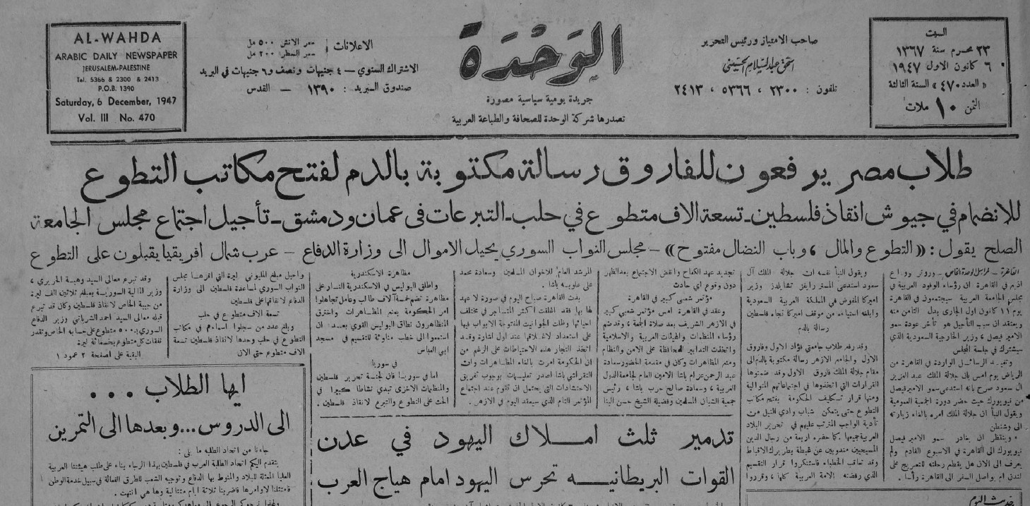 The paper reported on mobilisation across the Arab world. These are the seeds of the Arab irregular armies, that within weeks would be invading British Palestine and attacking Jewish civilian outposts. Al Wahda also proudly boasted of attacks on innocent Jews in Aden, highlighting the regionalisation of anti-Jewish violence from the earliest days.