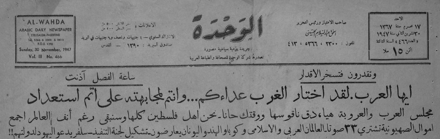 The morning after the UN vote, neither Ad-Difa nor Al-Wahda reported the partition as a political event. Instead, both papers erupted with outrage and calls for Arab mobilisation across the region. The pages were saturated with threats, anti-Jewish invective, and demands for an ‘Islamic Front’ to rise.