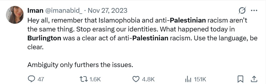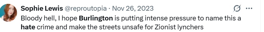 This was a national, rather than just a state-wide strategy. The Palestinian Youth Movement – affiliated with the PFLP (which is a designated terrorist organisation) – posted about the “targeted hate crime”: