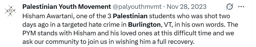 On November 25, 2023, three college students were shot on a residential street in Burlington, VT – the largest city in America’s second-smallest state. The three, Hisham Awartani (Brown University), Kinnan Abdalhamid (Haverford College) and Tahseen Ali Ahmad (Trinity College) were visiting during their Thanksgiving breaks.