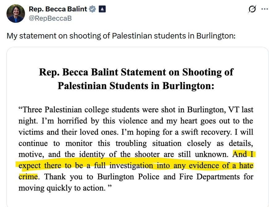 Representative Balint declared that the students were shot “for no other reason than that they are Palestinian.” Senators Sanders and Welch went further, actually submitting a Senate resolution that states as fact that the three were “attacked simply for wearing a scarf… and speaking in Arabic” – a claim flatly contradicted by the investigative record.